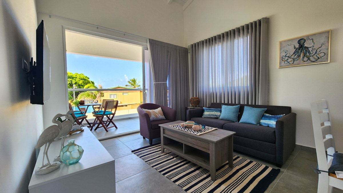 BlueView 15A is a tranquil ocean oasis where you can dive, snorkel, explore, or just relax! Our oceanfront home in Marazul Dive Resort is nestled between emerald hills and turquoise sea. Walk out the front door, right down the stairs into the beautiful Caribbean Sea. You will love the ocean views and sunsets, especially from the bedroom terrace. Enjoy the private and quiet location at the far end of the resort. This is the perfect getaway to unwind away from the busy tourist area of Willemsted!