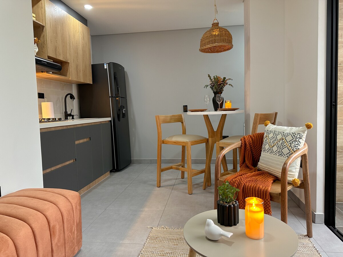 Enjoy Medellín from this modern apartment in Sabaneta with balcony and mountain views. Just minutes from the metro and the main park. Perfect for tourists and business travelers. It has fast WiFi, Smart TV, equipped kitchen, coworking, elevator and 24-hour security. Access to shared wet areas (hot tub, sauna and steam room). Strategic location near cafés, restaurants, supermarkets and public transport. Perfecto para 2 personas. Two more can be accommodated on the sofa bed.