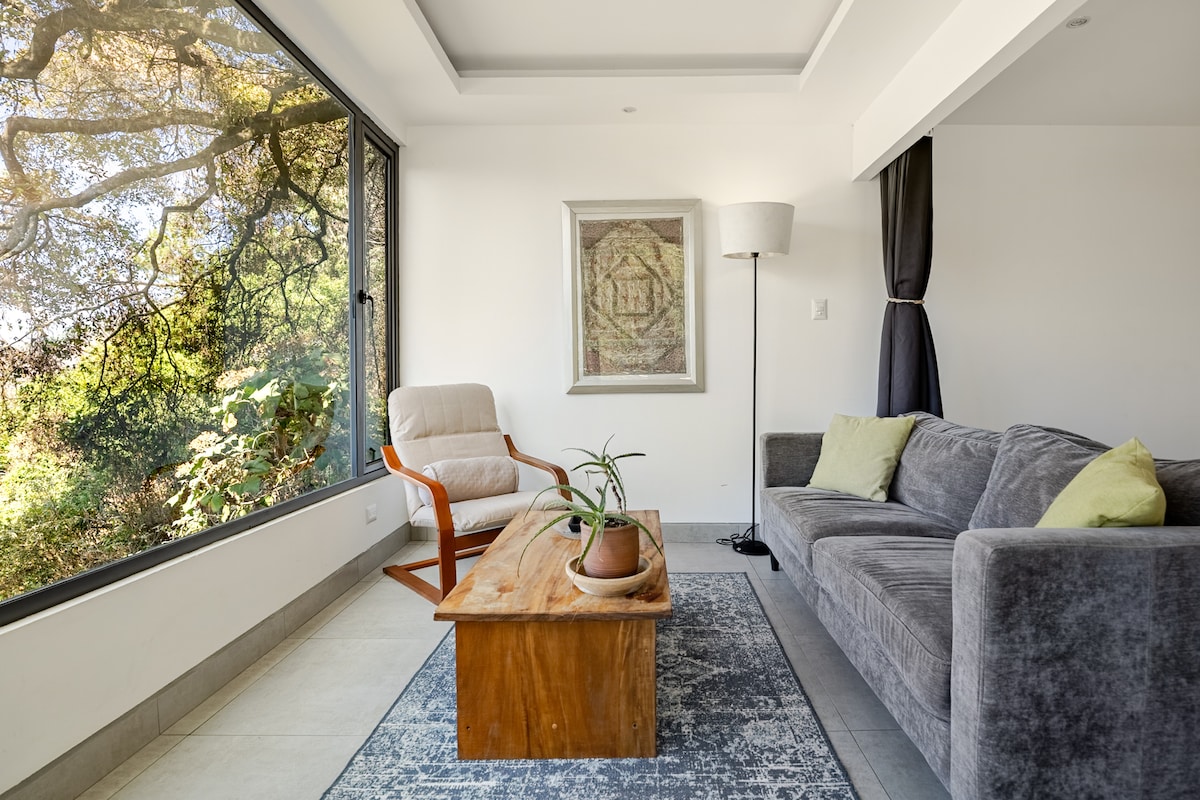 Escape to an expansive designer apartment in the mountains offering panoramic volcano views and generous living space. With a full kitchenette, lounge area with fireplace, and carefully curated finishes, this beautiful home feels open and calm - as if crafted for long mornings with coffee on the balcony or evenings with wine as the forest settles into quiet. Hidden in a private reserve focused on conservation, it's the ideal setting for couples, remote workers, and slow travelers alike.