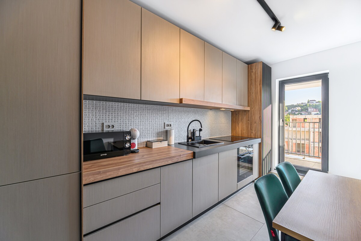 Spacious 2-Bedroom Apartment with Panoramic Views in center of Brașov: This apartment is situated on the 8th floor of a classic building and boasts an amazing panoramic view of Brașov's old town, and 2 steps to AFI mall. The space includes: - Two bedrooms; - Two modern bathrooms; - A large, fully equipped kitchen ideal with living space; - A large kitchen with living area. Big windows with amazing city views. Perfect for short or long stays, with everything you need for a comfortable visit!
