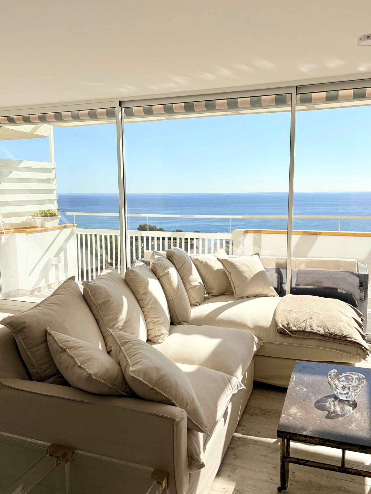 Unique panoramic views of the bay of S’Agaró. Duplex apartment with two double bedrooms and two bathrooms on the upper floor, and a living-dining area with a fully equipped kitchen facing the sea on the lower floor. Decorated with artwork and original 20th-century design pieces. Spacious terrace with sofas to enjoy the views. Private parking and communal pool. Direct access to the beach just a 5-minute walk away and 10 minutes from the restaurant and shopping area of S’Agaró.
