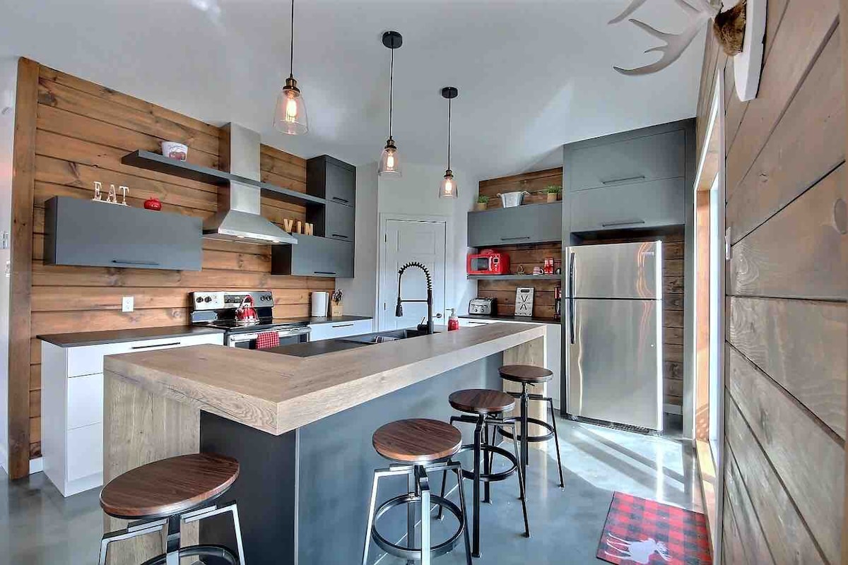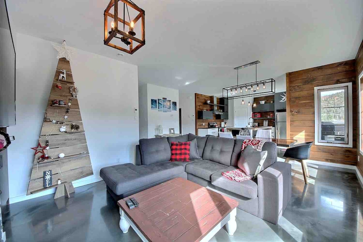 Welcome to outdoor lovers! The Grand Duc offers beds for the whole family, storage space, heated floors upstairs to warm you up after a long day in nature and a gas fireplace for more atmosphere! A great place to stay for vacationers. Spacious and comfortable, it is located in the heart of a mountain biking center, near a Nordic spa and 10 minutes from the picturesque village of Anse Saint-Jean, one of the most beautiful villages in Quebec!
