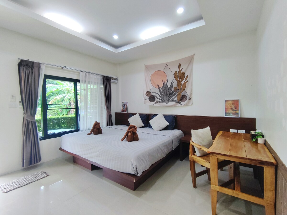 Forget your worries in this spacious and serene space at Baan Narapas, surounded by greeneries.🌿🌳🌵🌴 Easily relax yourself at the patio or even the king size comfy bed. 🍳🍝 Enjoy cooking like you are home in your private kitchen 🍽️ 📝💻 desk and chair for working space Located in local village area, next to Mauy Thai camp, with 10-15 minutes walk to supermarket or Makro and 10 mins drive to Aonang Beach by motorbike. 🛵🚲We also have some bike & scooter for rent during your stay here.