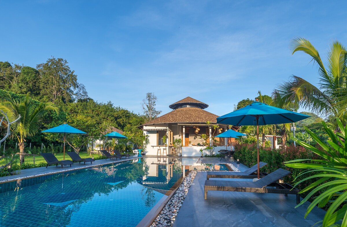 A brand new villa with a spacious area of garden. Big salt swimming pool is ready to serve our guests. The villa located only 10 mins from the most popular beach in Krabi where they called “Aonang Beach”. The villa surrounding around pure nature, green area, and small canal. The villa is very welcome all guests who love nature travelling. Moreover, we offer organic fruit farm on site for you to experience.