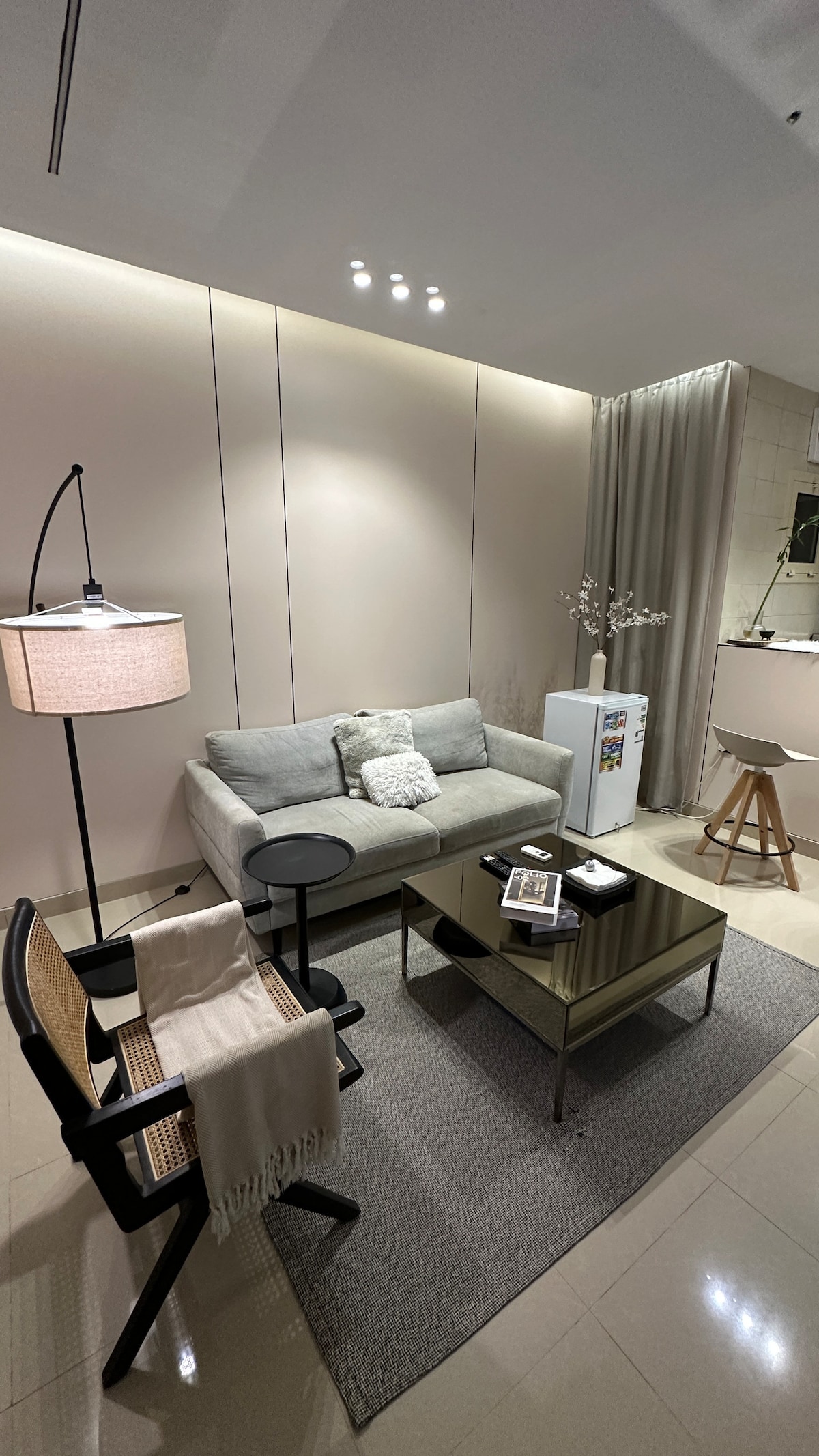 شقة فندقية بغرفة نوم واحدة مع غرفة معيشة وشرفة مع ركن قهوة مميز اهرب إلى هذا الملاذ المريح بغرفة نوم واحدة المصمم للراحة والأناقة. مثالي للمسافرين المنفردين أو الأزواج، حيث يجمع بين الراحة العصرية ولمسة من الفخامة: غرفة نوم مريحة تحتوي على سرير بحجم كوين مع أغطية ناعمة وفاخرة. غرفة معيشة مشرقة تضم أريكة مريحة وتلفزيون ذكي وديكور أنيق. شرفة خاصة مثالية لاحتساء قهوتك الصباحية أو الاستمتاع بغروب الشمس. إنترنت سريع وأجواء هادئة للاسترخاء أو إنجاز العمل.