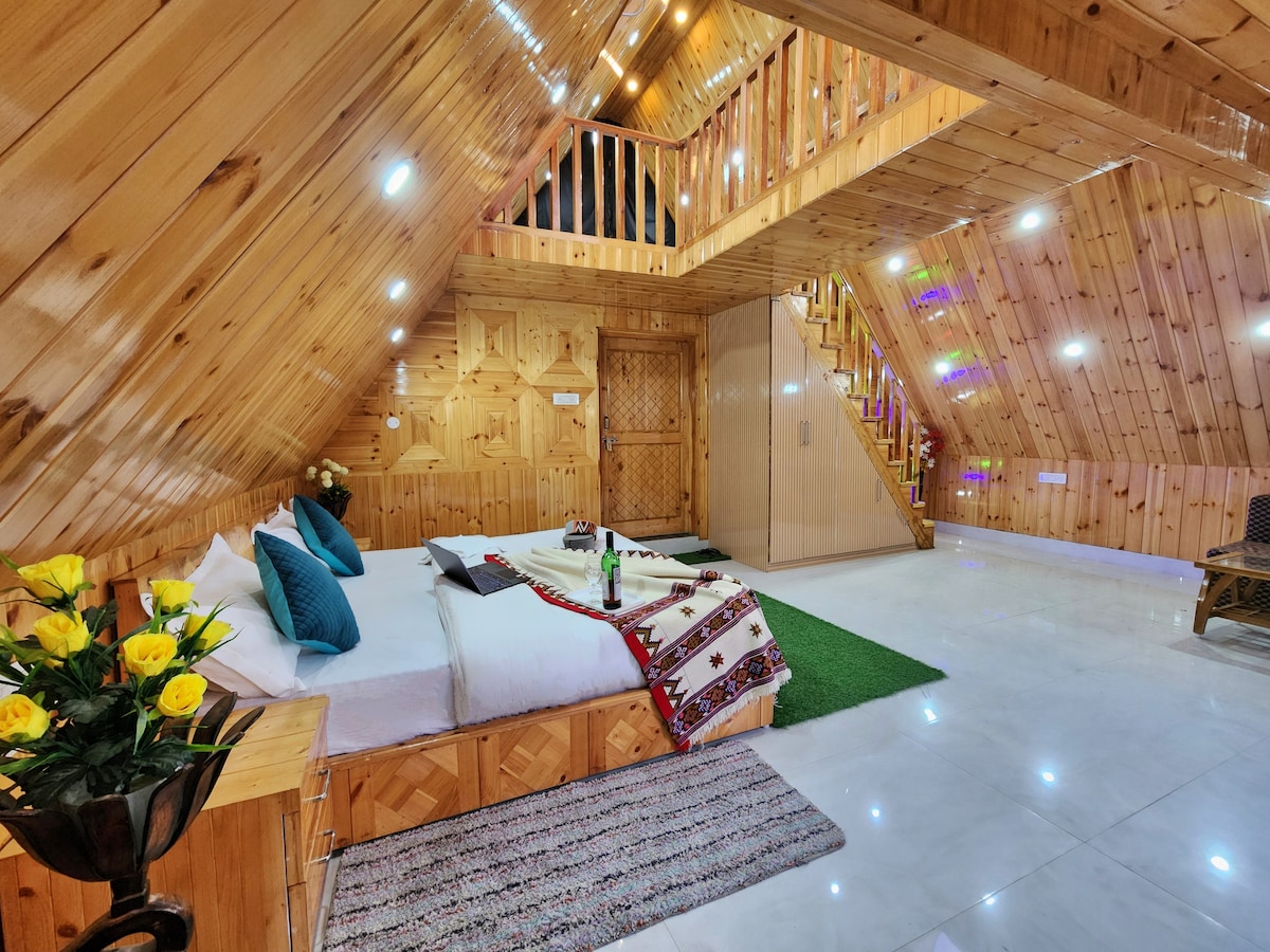 * Relax with the whole family at this peaceful place to stay. a wooden cottage in the middle of mountain with a spectacular view * there's a spacious bedroom, and an attic which function as a bedroom * bone fire 500/- * Broadband Wifi free * our cottage is in one of the most beautiful spots in the town. * Every single guest who stayed with us left happy. * there's a 700 meter trek, hut 99% of the young adults can make it.