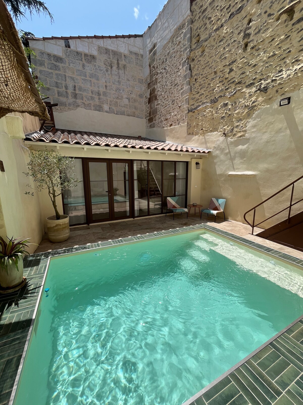 Relax in this haven of peace, intimate and without vis-à-vis in the heart of the charming village of Vallabrègues, capital of basketry surrounded by Provençal stone houses. Relax in the pool and in our room with its queen size bed and freestanding bathtub overlooking the interior courtyard. A moment of romantic relaxation guaranteed.