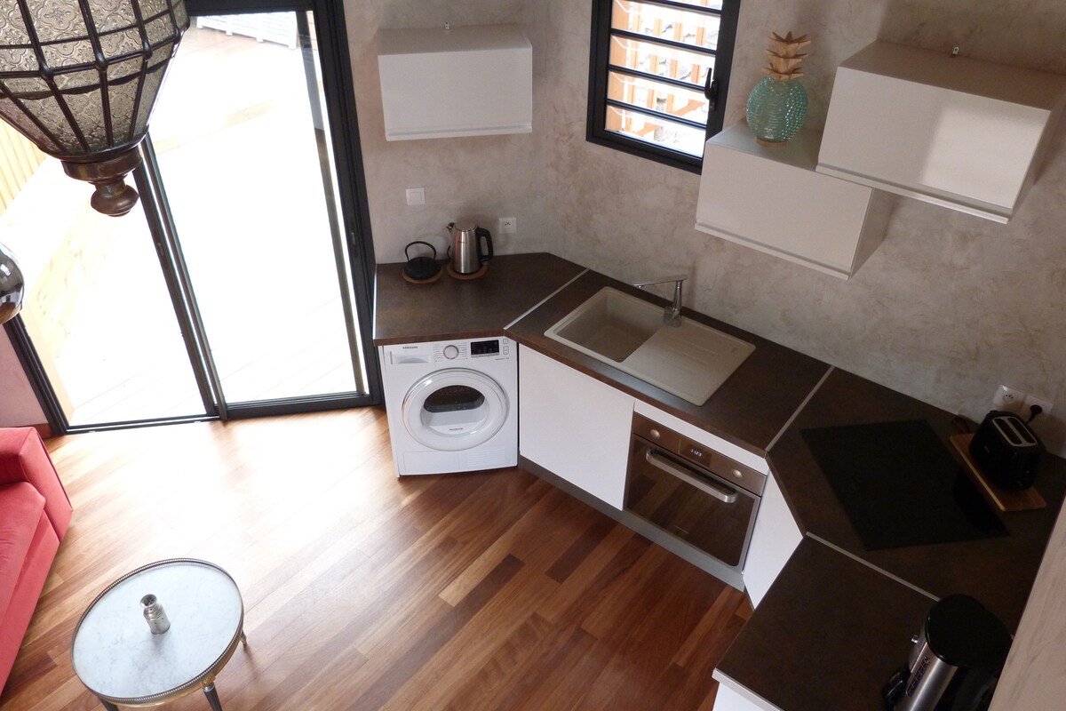 Studio on two floors. On the ground floor, living/dining room and bathroom. Outside you will find a kitchen equipped with a washing machine available. Upstairs, a large air-conditioned bedroom with storage and a desk. The king size bed is equipped with a mosquito net. All in a large wooded garden with swimming pool. We are 5 minutes from the airport. (For transfers ask us by message) We'll wait right here for you!