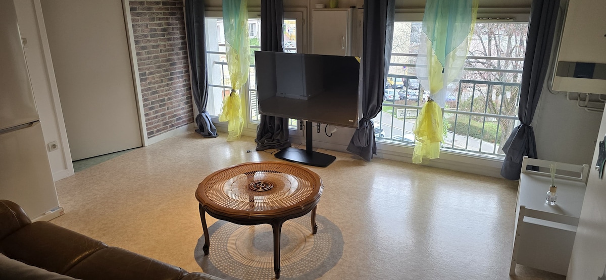 Bright, quiet and well-located apartment, close to Auchan Centre Deux, transport and shops. Large room of 20 square meters with a separation curtain, offering two sleeping areas: one side with a double bed, the other with a 3-bed bunk bed. Friendly stay with a click-clac, flat screen, work area and fast wifi Fitted kitchen (oven, microwave, Tassimo. Infant crib available Municipal swimming pool nearby next to children's park 20 m away, bike rental next door.