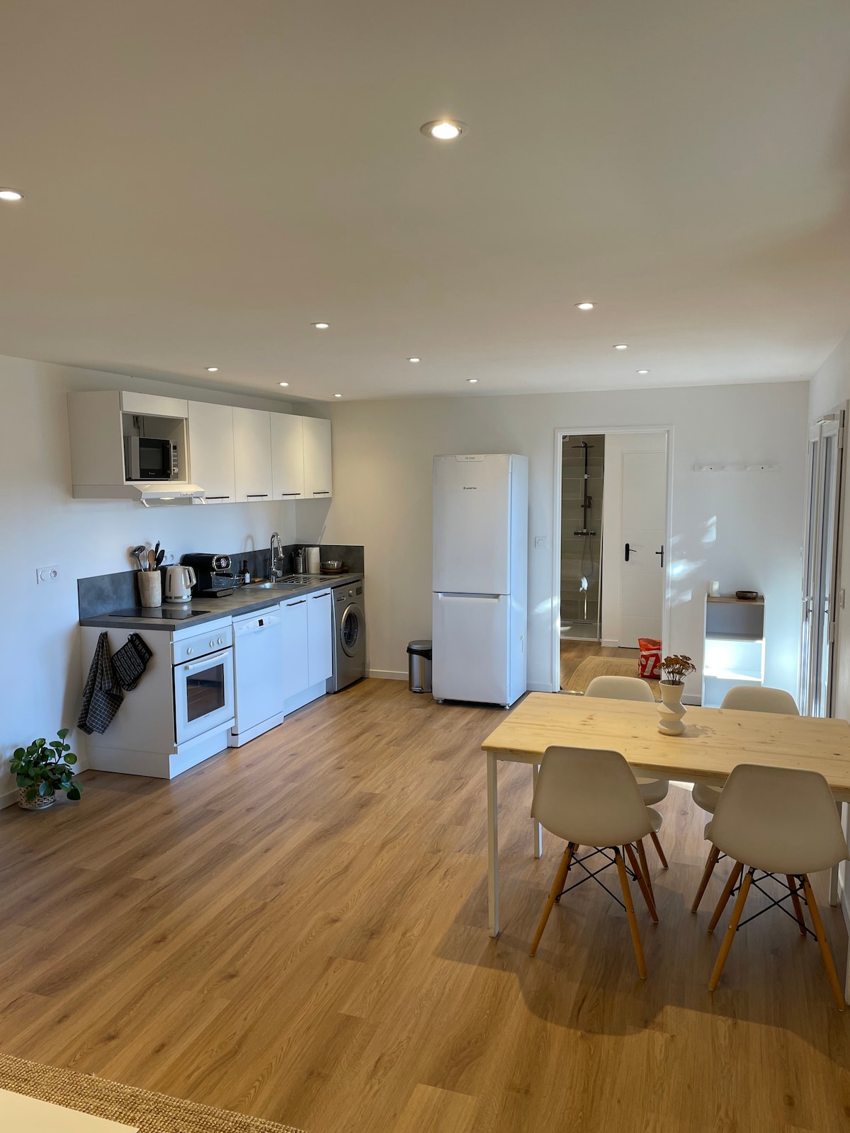 Relax with the whole family at this peaceful place to stay. It is minimalist (20 m²) but very cozy and functional. It is ideal for a couple or family with a child. Ideally located, you will be a two-minute walk from all the shops in the village (grocery store, butcher shop, bakeries, pharmacy, doctor's office, pizza trucks, restaurant, etc.). Bed linen, towels, Wi-Fi and cleaning are included in the price.