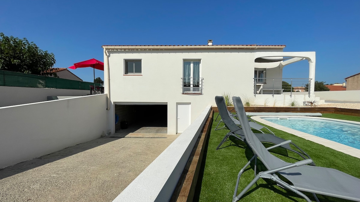 New and well-equipped 4★ villa of 100 m² in Saint-André, a quiet village south of Perpignan, between the sea and the Albera Massif. Ideally located to discover our region, 10 minutes from the beaches, 15 minutes from Collioure and 30 minutes from Spain. Capacity 6 people, 3 comfortable bedrooms, a bathroom and a shower room, air conditioning, fast wifi, private parking. Terrace equipped for dining and relaxation and secure private pool. Shops and activities nearby, quiet residential area.