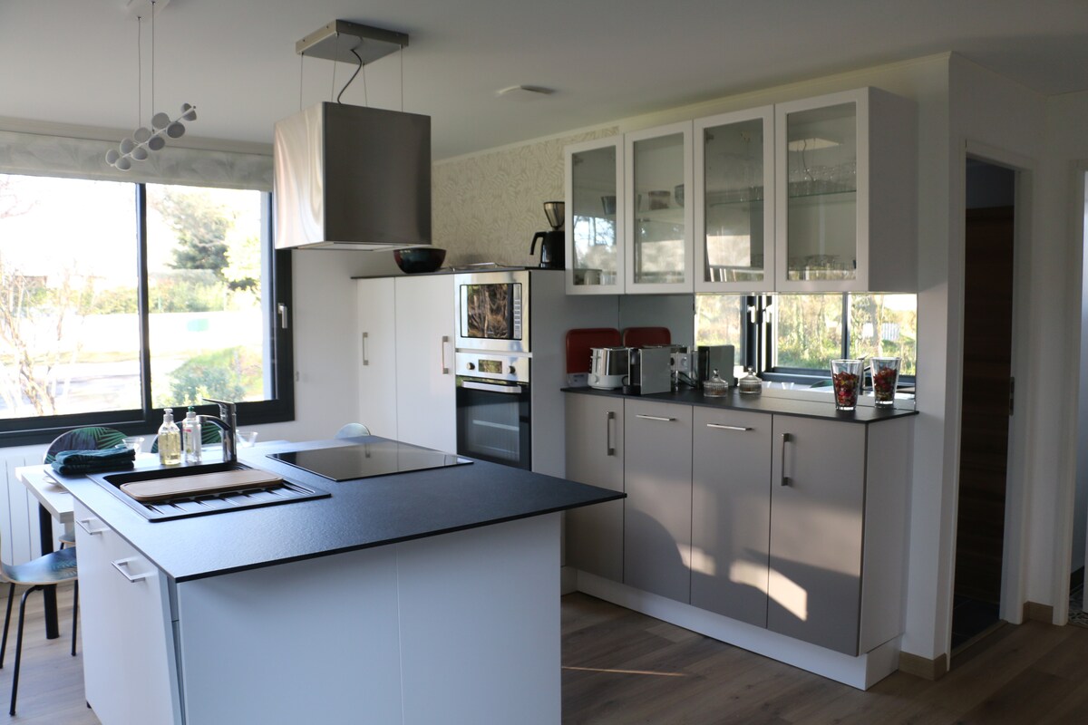 Unique ! Design beach house in Morbihan in Brittany! Direct access to the beach at the end of the garden, The house is new, fully equipped and you are the only occupants of the premises, Direct view of the beach / the sea from the living room, the kitchen, the terrace, the roof terrace and one of the bedrooms upstairs. Sheets, towels and cleaning included, washing machine and dryer. Many activities nearby: walks, cycling, sea kayaking, kite-surfing, tree climbing, cultural visits, boating...