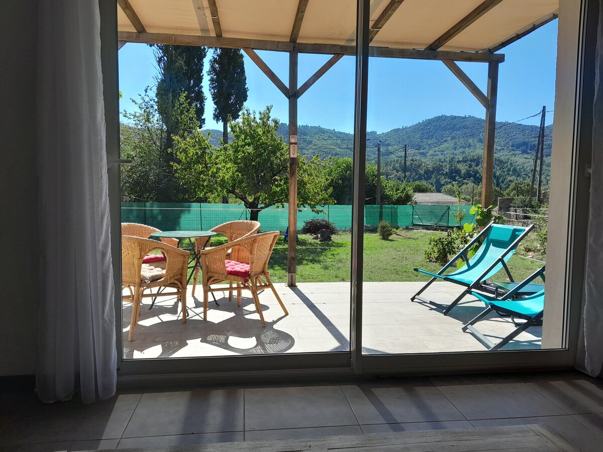 Charming independent stone mazet, renovated in 2019, 32 m². Composed of two rooms, a terrace and a garden. South-facing terrace and garden with pretty view of the Cévennes mountains. On the ground floor, equipped kitchen, small living area with sofa bed, neat and warm decoration. Upstairs, bedroom with 160*200 bed, small office and bathroom with toilet. Located in a small quiet village 10 minutes from Anduze and tourist activities.