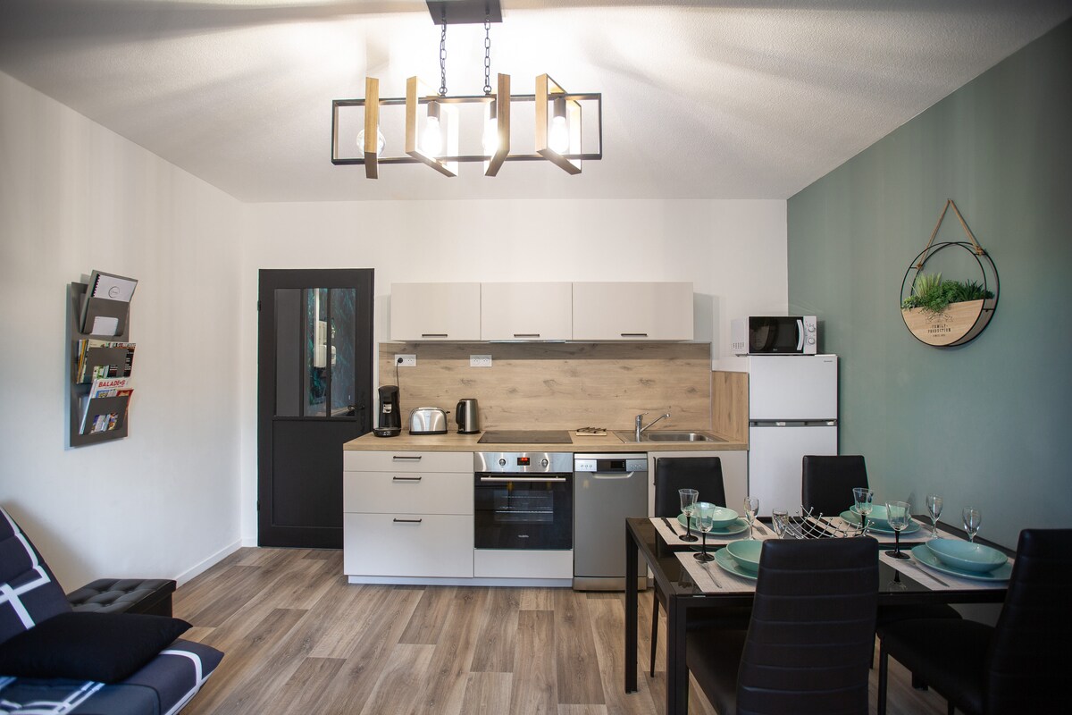We welcome you to our independent studio (25 m2). It is equipped with a kitchenette, a "cocooning" area with sofa bed, a space with double bed, a separate bathroom (shower and toilet) and a private outdoor area. Quietly located, 10 min walk to the city center and the start of many hikes, the cottage is also 30 min to the Font d'Urle family ski area. Athletes, walkers, city dwellers, children, parents, seniors, French speakers or not, all are welcome!