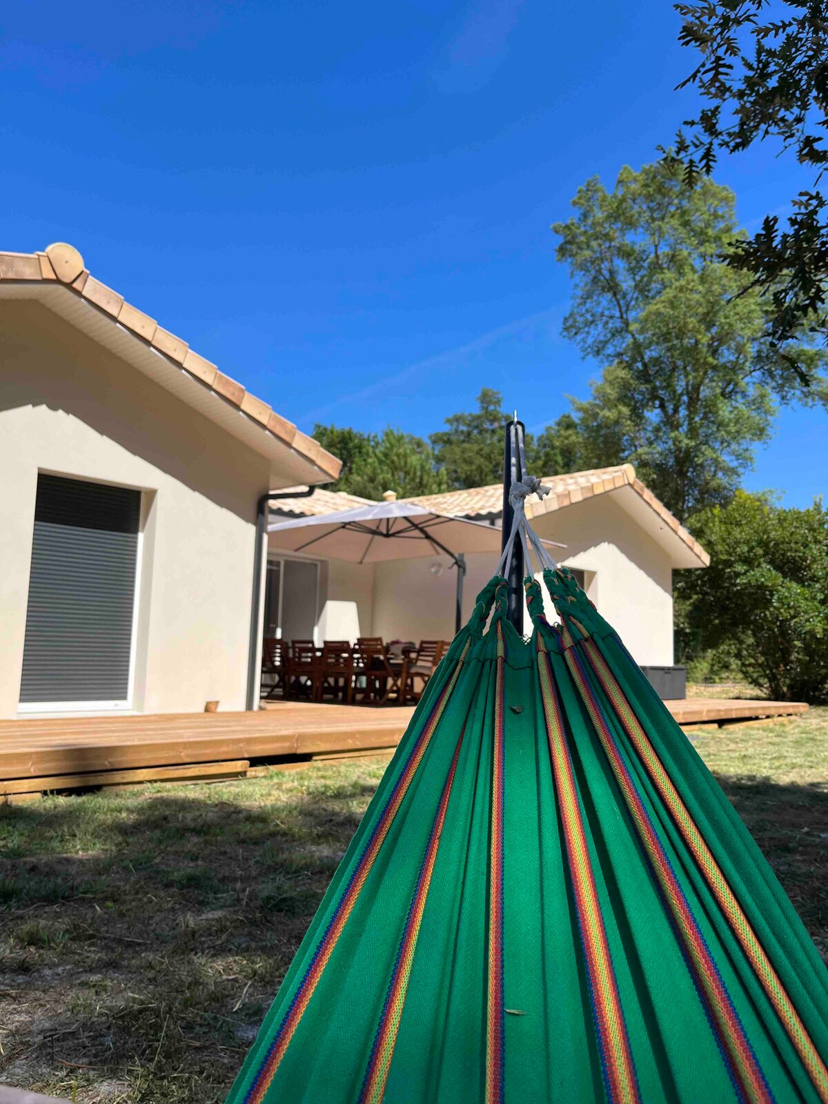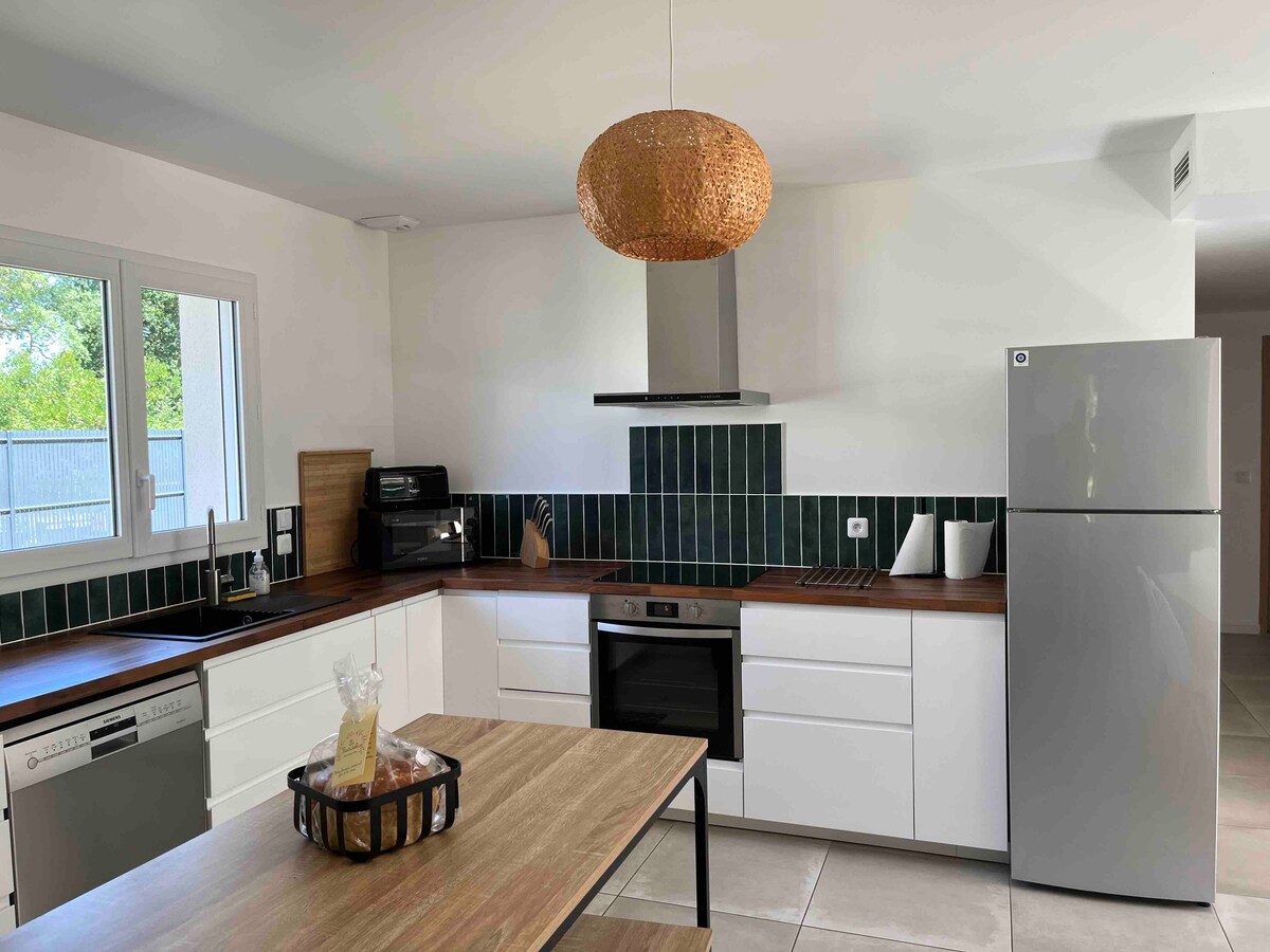 Nice house for a relaxing stay for families or groups of friends. You will find 4 bedrooms in total (2 with 160 cm beds, 1 with 160 cm bed and private bathroom, 1 with 160 cm bed + sofa bed) 1 bathroom (shower + bath), 1 fully equipped open kitchen and a living room with 2 sofas. The dining room has a large bay window overlooking a large wooden terrace. Outside, everything is there to make you have a good time in the shade of the oaks or a parasol.