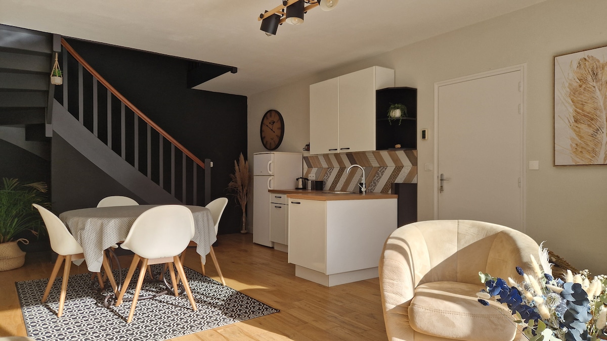 Located in a cul-de-sac, our 80 m² cottage is a place conducive to rest and relaxation. You will be 2 minutes from the shops (bakery and grocery store, pharmacy...) and 300 meters from a bus stop to Angers but also 10 minutes from the banks of the Loire (canoe-kayak rental, Loire by bike), 15 minutes from Angers and 18 minutes from Terra Botanica by car. Hiking trails in the countryside and forest are accessible from the cottage.