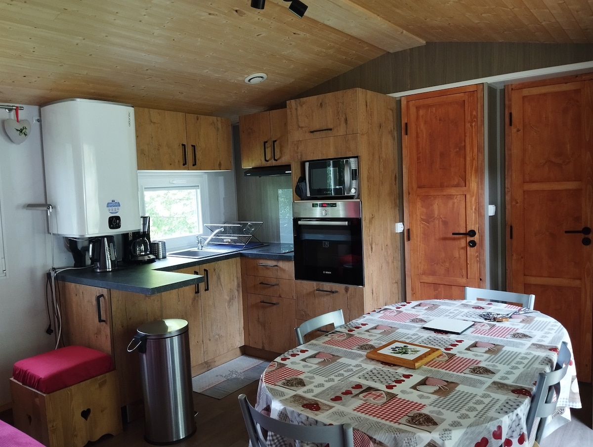 I rent the upper part of my chalet (car and eco-construction) with the outdoor space in front, located in a subdivision of a dozen houses at the bottom of the village. One bedroom (140 cm bed) on the ground floor and another (140 cm bed too) upstairs. The equipment is simple, without microwave or dishwasher.