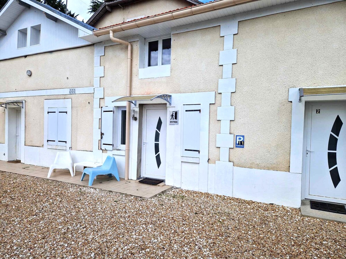 Very nice studio with double bed, equipped kitchen, bathroom with multi-jet shower, hairdryer, heated towel rail. Features all linens, Wi-Fi and a keybox for self check-in. Large private parking with a reserved space, large van possible. Access to the park of the residence where armchairs and garden tables await you All quiet, close to nature in Razac sur l'Isle, 100 m from the greenway and its 86 km of bike path.