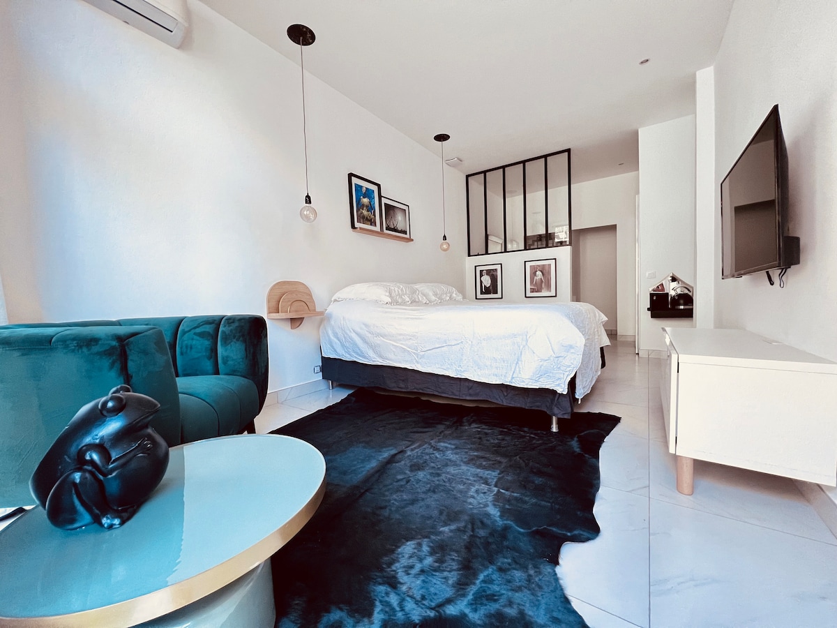 An ideal location between the sea and the mountains, quiet in a residential area. Large Studio (54 m2) independent on the ground floor of a villa with 2 separate garden levels. The apartment is at the end of a cul-de-sac, absolute quiet but very close to all amenities. We provide guests with our pool and give them priority. The flat-screen TV is connected and has FOOT+ and Amazon Prime Video.