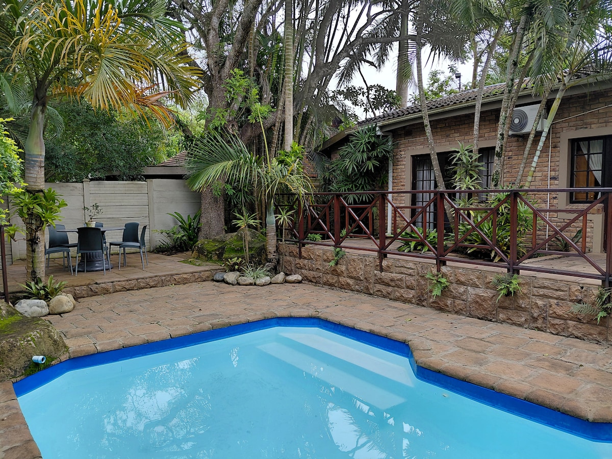 The Garden Cottage is a spacious ground floor self catering unit. A hassle free stay in a safe, 24/7 secured area, called Monzi. Barbeque and pool facilities availeble. The village provides a 9 hole golfcourse, tennis and squash courts, which can be used against a small contribution. St Lucia is only 15 min away, with beaches, shops, restaurants and Isimangaliso Wetland Park, Cape Vidal, a great variety of bird and wildlife. Imfolozi HluHluwe game park you'll find the big 5, only 45 min away