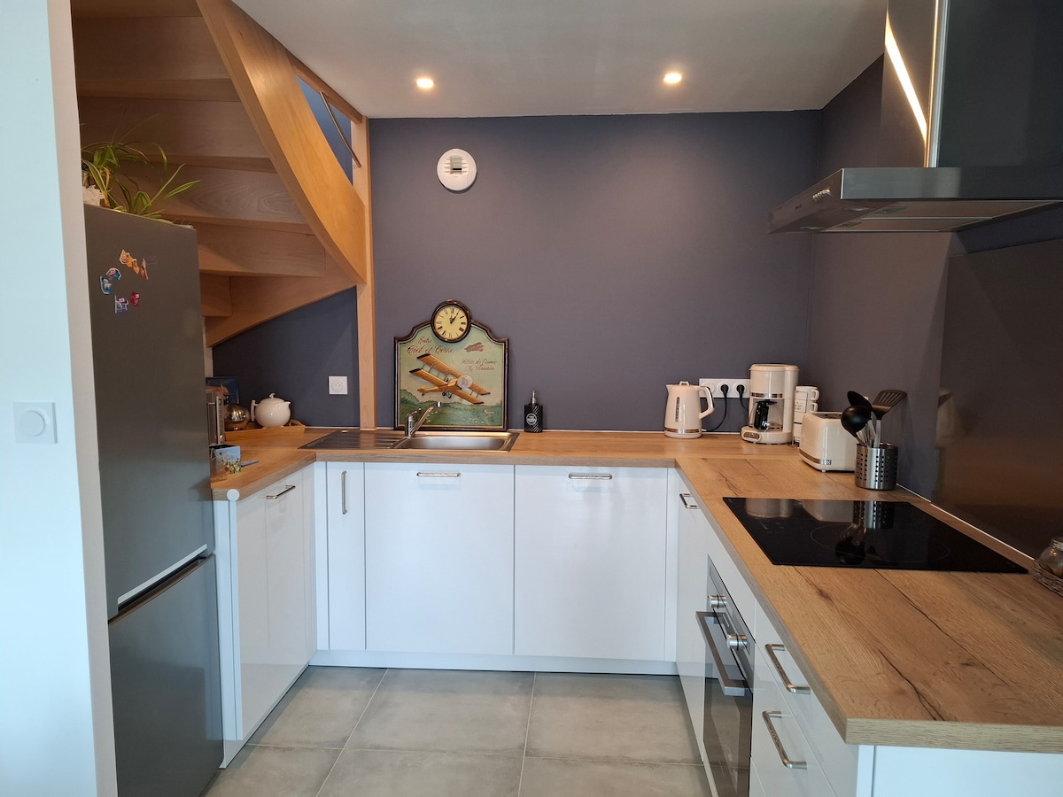 Old house refurbished, with 2 bedrooms and a large living room, dishwasher, oven, microwave, kettle, Tassimo coffee maker, toaster. View of the countryside and horses. High-speed fiber for remote work. For 1 person or for 5 comfortably, and a sofa bed for 2. Less than 5 minutes from Rennes Exhibition Park, the airport, and 10 minutes from Rennes. A few minutes from the Cicé Blossac Golf Course or St Jacques de La Lande. Between Bruz and Goven. The fastest, easiest way to access the 4-lane highway.