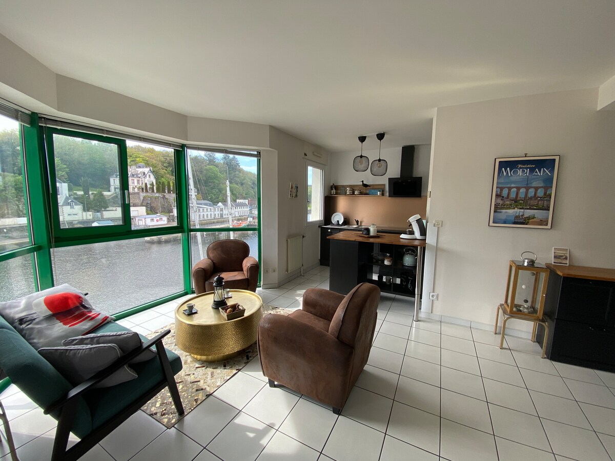 Curl up, unwind, and let the world fade away... Apartment overlooking the sea and the marina, spacious and comfortable, equipped for 4 people in a luxury residence with elevator, with stunning views of the port of Morlaix. The city center is in the immediate vicinity: you can walk or bike along the quays. Free private parking included, garage on request. Close to the beaches of Carantec, Plougasnou, Île Callot, Île de Batz, Dourduff-en-mer, Locqu...