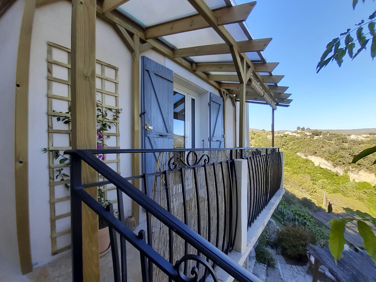 We will be happy to share with you a little of our "secret garden", nestled on the southern flank of a small village, between sea and mountain. Independent house (27 m2): on the ground floor, a living room with equipped kitchen area and EXTRA sofa bed 140 (children, small teens) The south-facing balcony will offer you a superb view during your meals/aperitifs... Upstairs, a bedroom equipped with TV, comfortable bed 140 and office area, shelves and wardrobe, bathroom with shower and toilet.