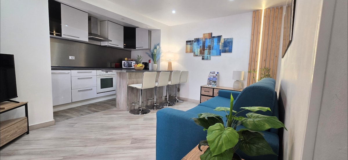 "SEAVIEWS BY JENNI MENTON" presents: Beautiful NEW 2-Room Seafront, on the Promenade du Soleil. 50 m2 of design, large 18 m2 terrace, sea view as if on a boat from the entire apartment. Designed for the comfort of 4 people. Highly sought-after decoration, high-end materials and amenities. CLOSED GARAGE* ELEVATOR AIR CONDITIONING SMART TV UNLIMITED HIGH-SPEED INTERNET BOSE BLUETOOTH SPEAKER A few minutes' walk to all shops and activities. Bus at the bottom of the residence, train station within walking distance.