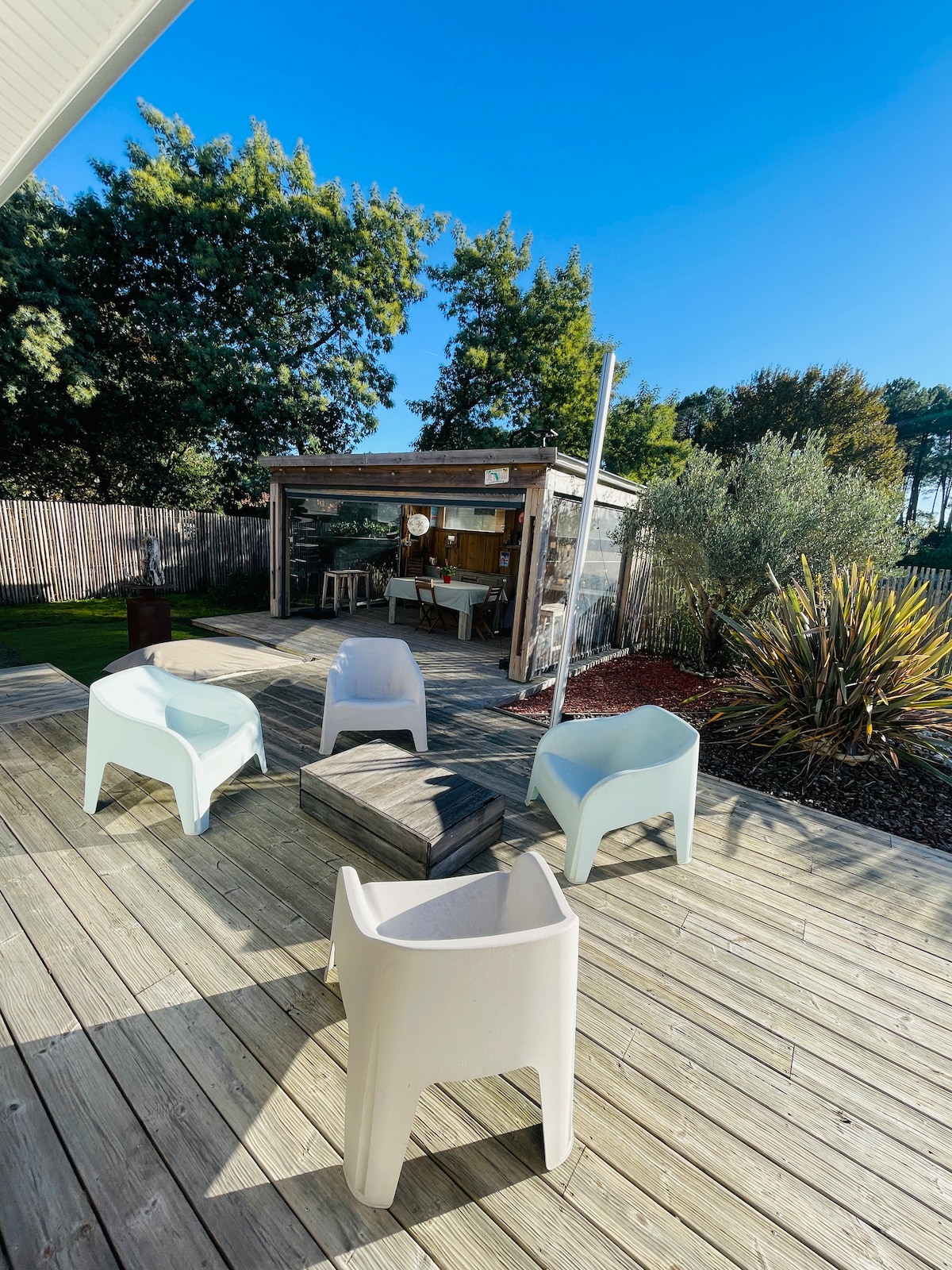 INSTA @lecarriou Direct bookings without commission: cecile.corret@gmail Welcome to your Villa in the heart of the Landes forest. Surrounded by centuries-old oaks in the middle of a pine forest in a quiet hamlet of about ten houses. It is located on a plot next to the main house. Cozy living room overlooking an open equipped kitchen, toilet, 1 bathroom with walk-in shower, 1 bedroom with 160 cm bed and 1 bedroom with 2 140 cm beds (bunk beds) Upstairs, large bedroom with 160 bed and bathroom, toilet