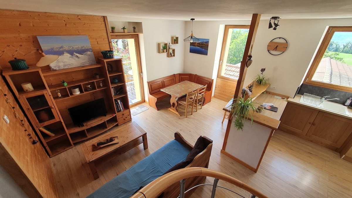 Welcome to the heart of a Savoyard village, between Chambéry and Grenoble, with views of the Granier and Bauges mountains. Come and enjoy a mountain experience in our 32 m2 studio, located on the ground floor of a house with a separate entrance. This cottage is very well equipped and can accommodate up to 3 people. Enjoy the spa from May 1st to Sept. 30th. Marked hiking trails start from the house. Two lakes accessible in 10 minutes, Collet d'Allevard ski resort and Lac du Bourget 30 minutes away.