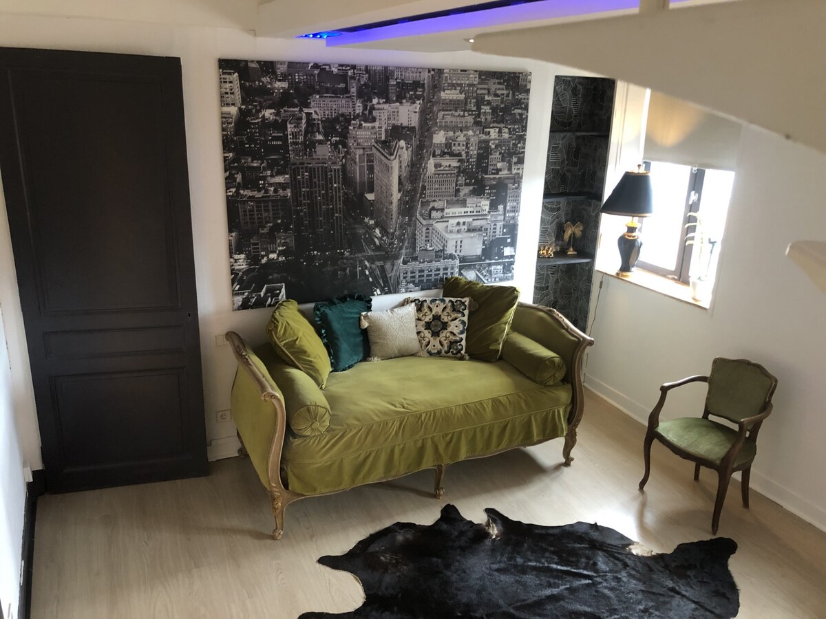 25 m2 studio on the ground floor, 10 min walk to the city center and 3 min to the banks of the Seine. It will seduce you with its mezzanine. It is located 17 minutes from Rouen Exhibition Centre, 25 minutes from Kindarena, 16 minutes from Biotropica. At the end of the street, Place du Champ de Foire, the F9 bus line will take you to Rouen. Free street parking (not always available) and free parking at the end of the street (Champ de Foire).