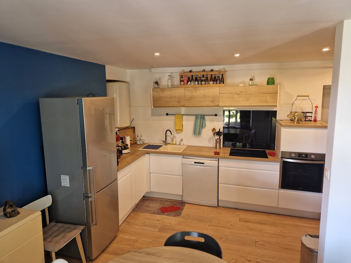 Escape to the third of our charming gîtes for 2 to 4 guests, just a stone’s throw from Lyon, in the quaint village of Vaulx-Milieu. This peaceful retreat combines rustic charm with modern comfort for a unique and unforgettable getaway. Relax in our private spa on the ground floor, featuring a 4-person jacuzzi and infrared sauna. Upstairs, the air-conditioned living area includes a kitchen, living-dining room, bathroom, and 2 bedrooms. The accommodation is entirely private. PARTIES ARE NOT ALLO