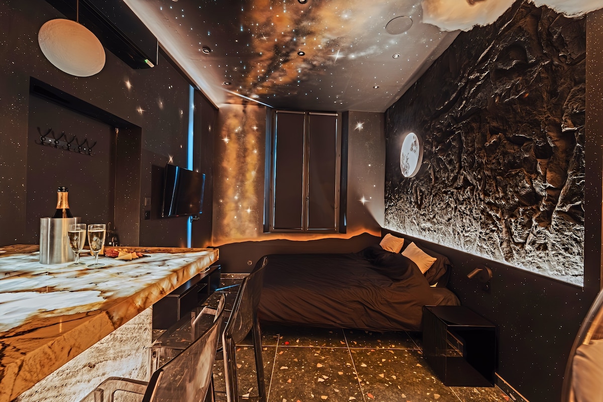 An aerial view captures the terracotta rooftops of the buildings, with a small private terrace featuring a round jacuzzi surrounded by wooden decking. Two lounge chairs are visible on the terrace, along with lush greenery adding a touch of nature to the urban setting.