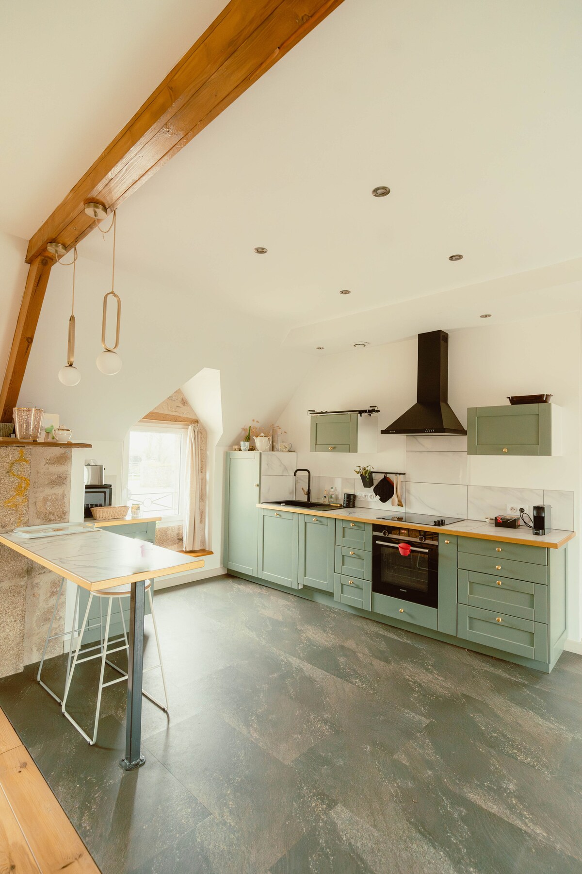 At the heart of the family farm, a breeding of sport horses, the Loft de la Sauvagerie can accommodate 4 people in an exceptional setting not far from the beautiful beaches of Cotentin, between the marinas of Saint-Vaast-la-Hougue and Barfleur. The 90 m2 loft was fully restored in early 2019. It consists of a large living room with a wood-burning stove and a well-equipped kitchen open to the living room. You will find a double bedroom and a bathroom with a bathtub.