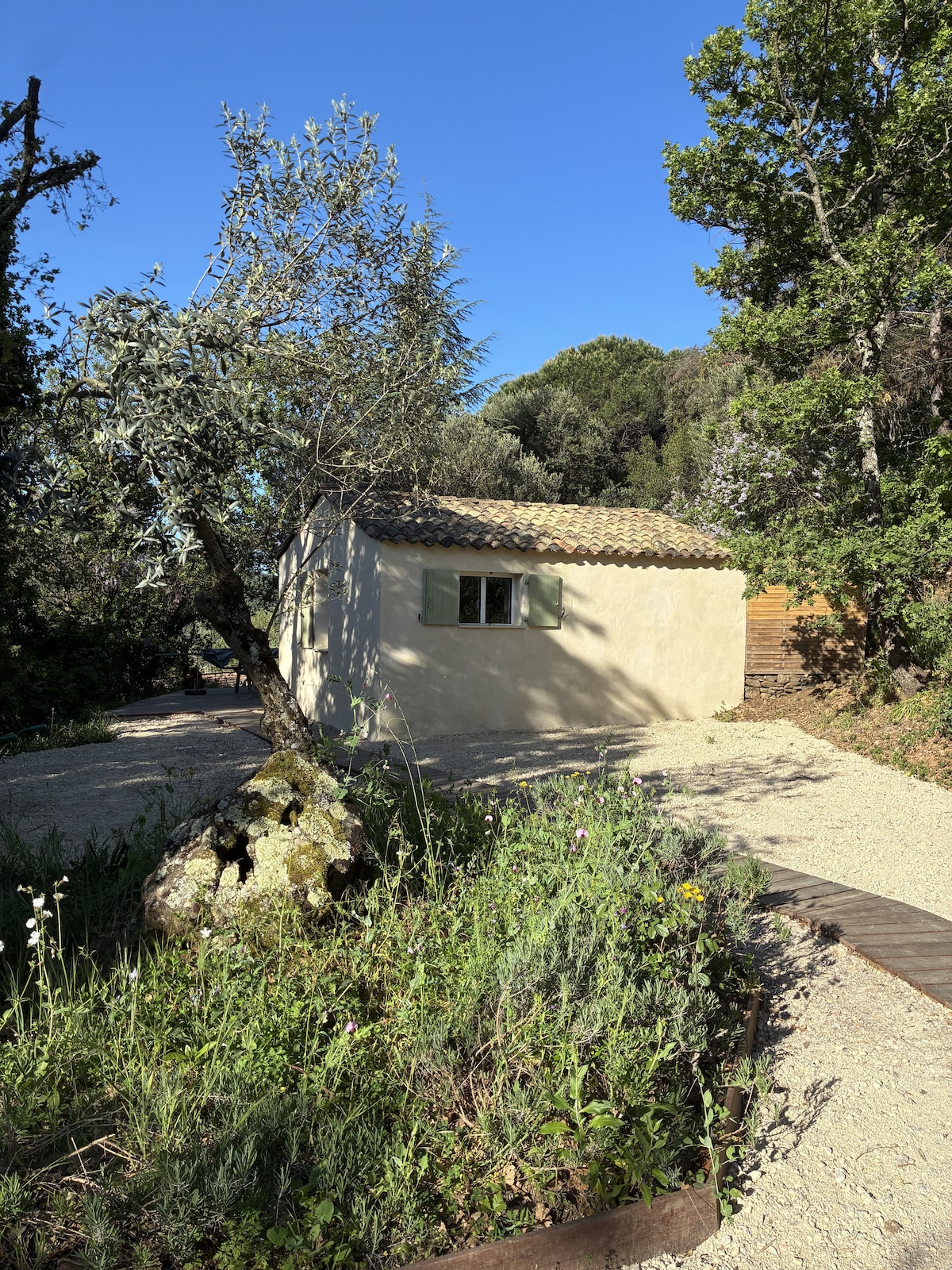 Welcome to our charming cabin in the South of France. This haven of peace has 2 comfortable bedrooms, a shower, an outdoor kitchenette and barbecue for outdoor dining. Located on a property inhabited by the owners. Access to the pool is reserved for RB&B guests. Enjoy the green and quiet setting, the song of cicadas and the southern sun. Highlights: close to Nice, Fréjus, Lac de St Cassien, St Croix, Gorge Penafort