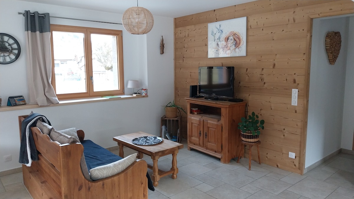 Furnished apartment in a wooden chalet in a mountain setting in the Mense subdivision, a bird's-eye view of the Aillons-Margériaz valley, for summer/winter sports fans: hiking, trail, via ferrata, skiing, and sliding... snowman and strollers...contemplate the landscape, lovers of local gastronomy, cheeses, charcuterie. A terrace, a garden to relax. View of the valley where the sun likes to linger in the evening on this slope. Let yourself be charmed. Arví