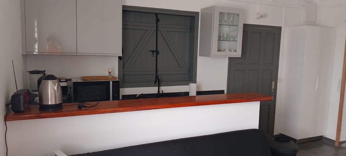 In Sofaïa in a very quiet residence, overlooking the lagoon of the great cul de sac marin we welcome you in this bungalow on Pilotis, from the terrace, you overlook the 3000m² of the wooded property. The Bungalow is equipped with a carefully decorated 25m² bedroom/bathroom set and equipped with quality equipment (160cm canopy bed, premium new bedding, spacious shower screen), air conditioning . The 25m2 terrace is equipped with a kitchenette, with all the necessities.