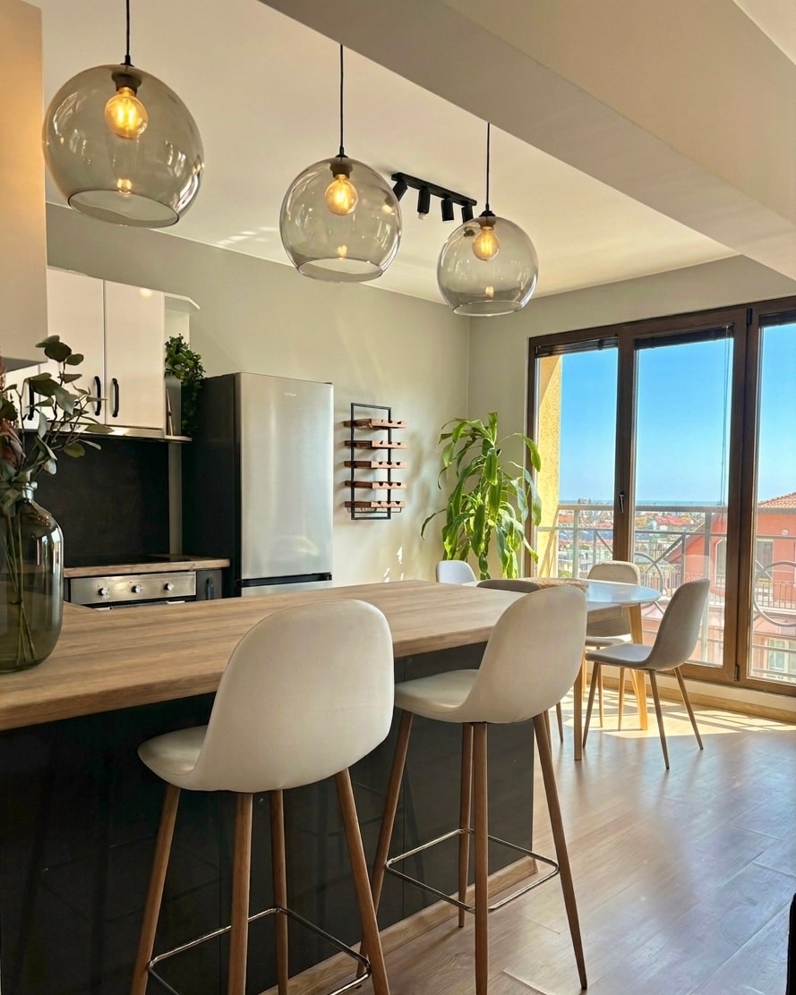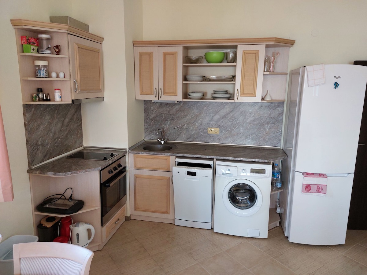 A cozy apartment featuring a beautiful glass-enclosed veranda, perfect for morning coffee, relaxed evenings, or remote work with natural light, just a short walk from Kabakum Beach and the Riviera coastline. Enjoy free access to the beaches, nearby mineral springs, cafés, and seaside restaurants. A comfy bed, a folding sofa, high-speed wi-fi, 2 workplaces with comfortable chairs, and a fully equipped kitchen make it perfect for relaxing stays, remote work, or exploring Varna and Golden Sands