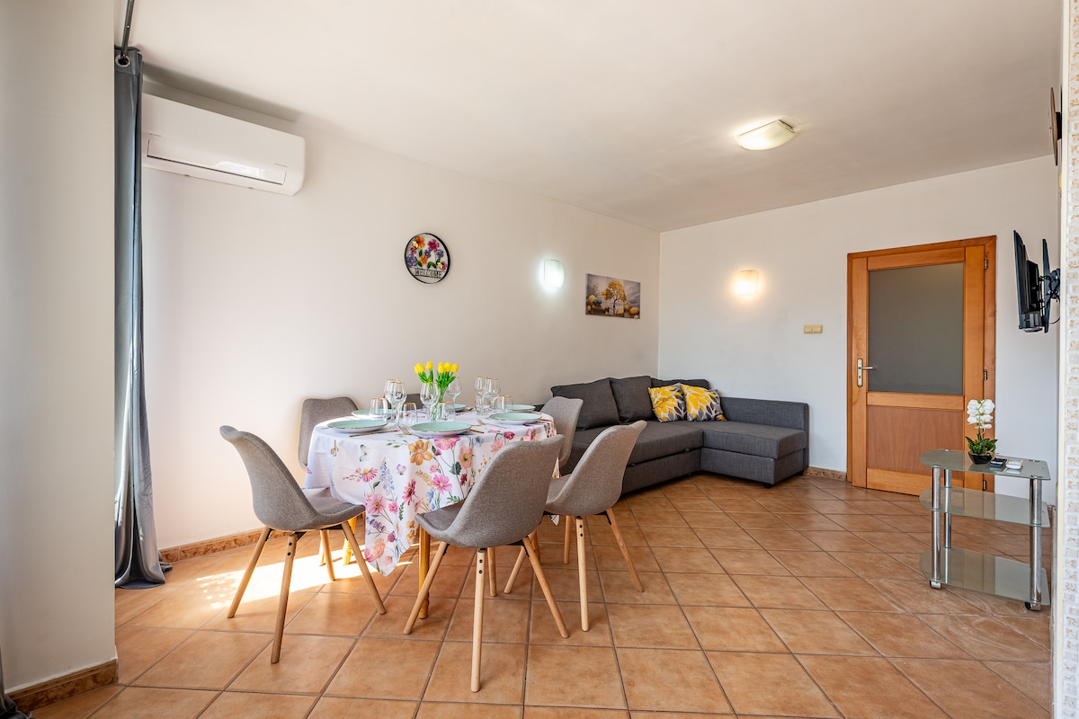 Nearby the sandy beach a completely furnished Summer Breeze apartment offers you a cosines and calm. Situated on the last floor its provided with a fantastic and nice decorated enormous terrace where you can spend all the time - taking your tea or coffee early in the morning, taking your lunch, drinking some fresh cocktail or cold white wine in the late afternoons, taking dinner or just relaxing with a nice book in hand. Supermarket 100m away and LIDL 1km away.