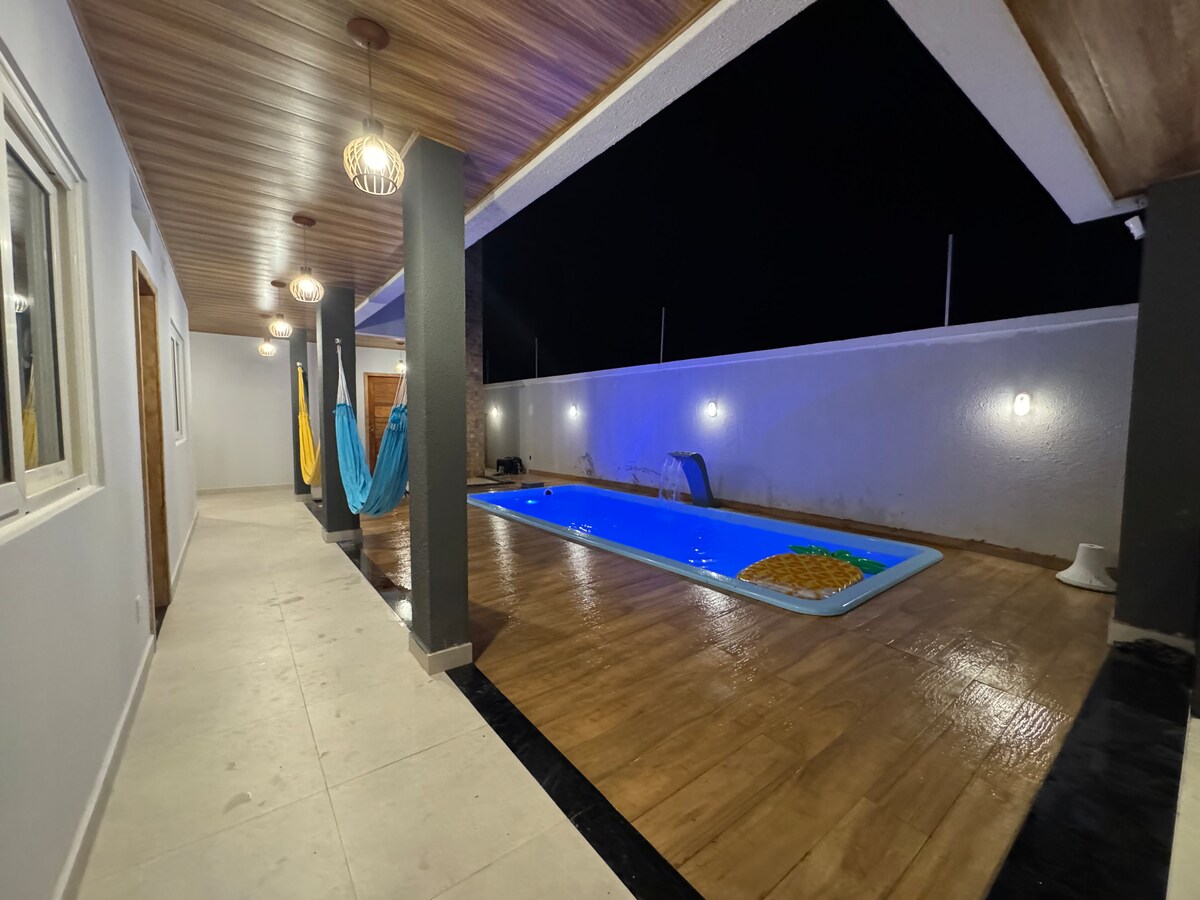 Divirta-se com a família neste lugar cheio de estilo e conforto com 3 suítes espaçosas,completas todas com central de ar,smart tv banheiros amplos, Lavanderia, máquina d lavar, roupa de cama p 10 hóspedes, banho e redes, Netflix, wi_fi, poço artesiano, cerca elétrica, câmera de segurança na frente da casa, cozinha totalmente equipada, e uma piscina maravilhosa para você aproveitar. Não forneço toalhas para piscina e praia. A casa é nova com acabamento de primeira e foi planejada cada detalhe.