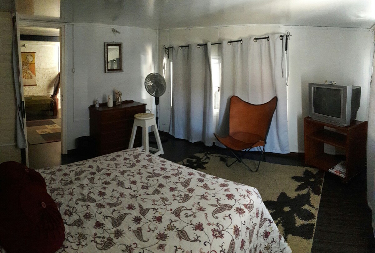"A place to share" is my workshop for making boxes and bags (A world of boxes) that we have adapted to receive guests from all over the universe! Independent of our house. Private bathroom with water heater. Air conditioning hot/cold. Refrigerator and microwave. Excellent Wi-Fi signal. It has three windows that give it a lot of light, ventilation and views of Solari Park. A deck at the back to rest. You'll love the place and we'll love to make you feel "at home".