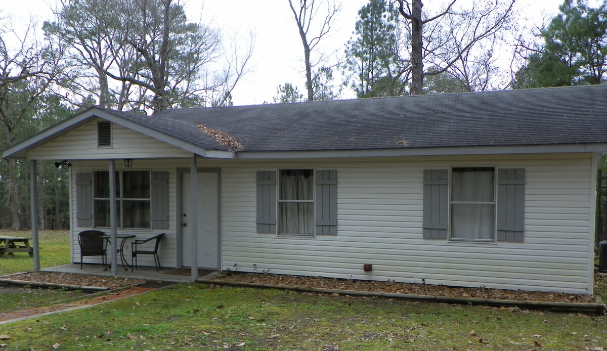 Very quiet home with a view over 50 acres of hay fields with large oak and pine trees sprinkled throughout. Lots of room to roam, walk a dog, keep a boat, horse, fish two ponds with bass. 8 miles from Lufkin or Diaboll, 7 miles from Angelina College. 20 minutes from Sam Rayburn. New two-bedroom country cottage. The property is very clear with lots of room. Events could be hosted "on the farm"! Wedding, Large Picknicks, RVs can park with full hookup 30 AMP and 50 AMP available and 110 plugins