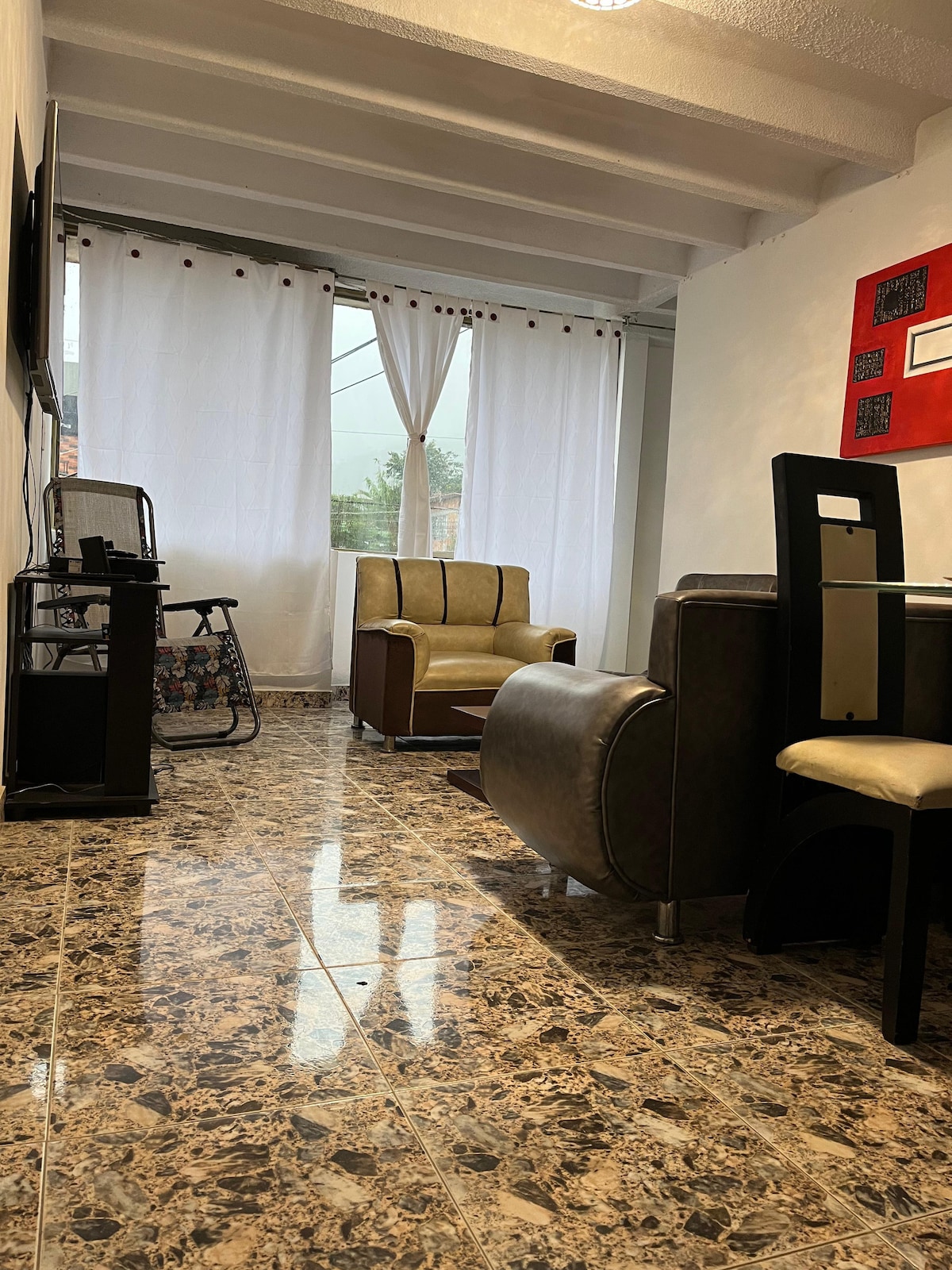 ApartaVibe Sandoná ofrece alojamiento cómodo y totalmente amoblado a tres cuadras del parque principal. Dispone de 3 habitaciones, sala con TV e internet y una terraza con vista panorámica. Ideal para quienes desean una estancia tranquila y bien ubicada en el corazón de Sandoná, Nariño. 🍃