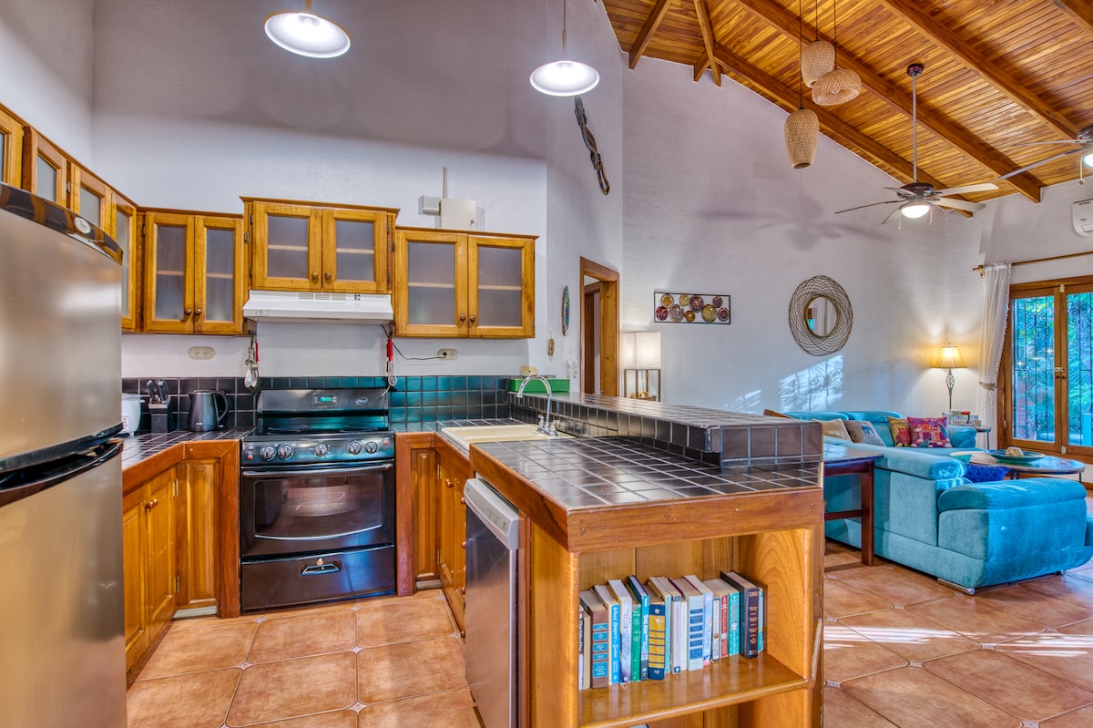 This fabulous house is nestled in the mountains, only 15 minutes from the beaches of Samara, and it is the definition of a peaceful retreat. Come here to be alone and write your novel, relax, or to spend quality time as a family. Situated on 20 acres of private land, filled with a variety of fruit trees (coffee, chili peppers, star fruit, plantains, lime, and more) you will experience the natural beauty of Costa Rica immersed in the sights and sounds of nature.