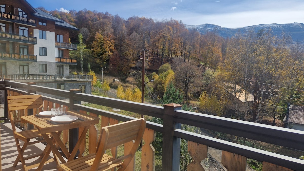 Magnificent and cozy studio style apartment. Fully renovated with modern furniture and amenities for maximum comfort. Harmonious nature with exterior and interior to match, perfect for peaceful vacation and warm memories. Cozy balcony with a view over a pine forest that provides fresh air and natural harmony on every season. ski-in/ski-out, just seconds away from newly renovated Kokhta lift + ski storage. Unit comes with a small kitchenette + amenities, TV, Wi-Fi, washing machine and etc.