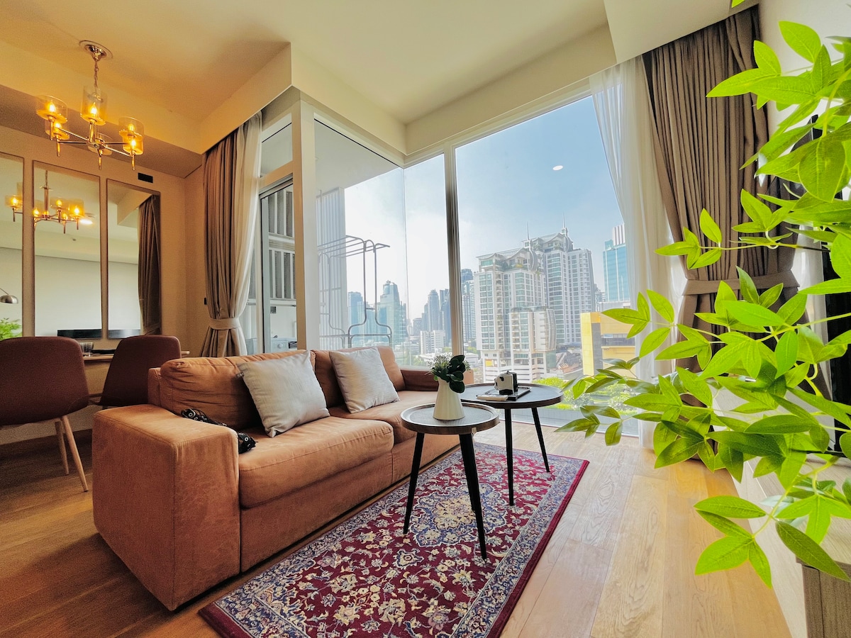 Wake up to panoramic Bangkok views in this stylish two bedroom apartment at Sukhumvit , right next to Ekkamai Gateway and BTS Ekkamai. Floor to ceiling windows flood the open living area with light and there is a fully equipped kitchen, smart TV with streaming and a marble bathroom. High speed Wi‑Fi and a desk make remote work easy. After exploring the city, enjoy the rooftop infinity pool or gym.