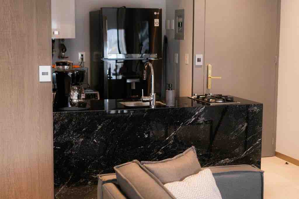65 m2 loft excellently located in the commercial area of Angelópolis, a few steps from Estrella de Puebla and the best shopping centers and restaurants in the area. Private terrace, king size bed, bedroom with home theater and panoramic view of the Estrella de Puebla and Volcanoes. A kitchen with built-in appliances and a refrigerator. Nespresso coffee machine. Bathroom with rain shower. Vanity mirrors. Washer-dryer. Indoor quartz bar. Private entrance. Private covered parking. 24-hour surveillance.