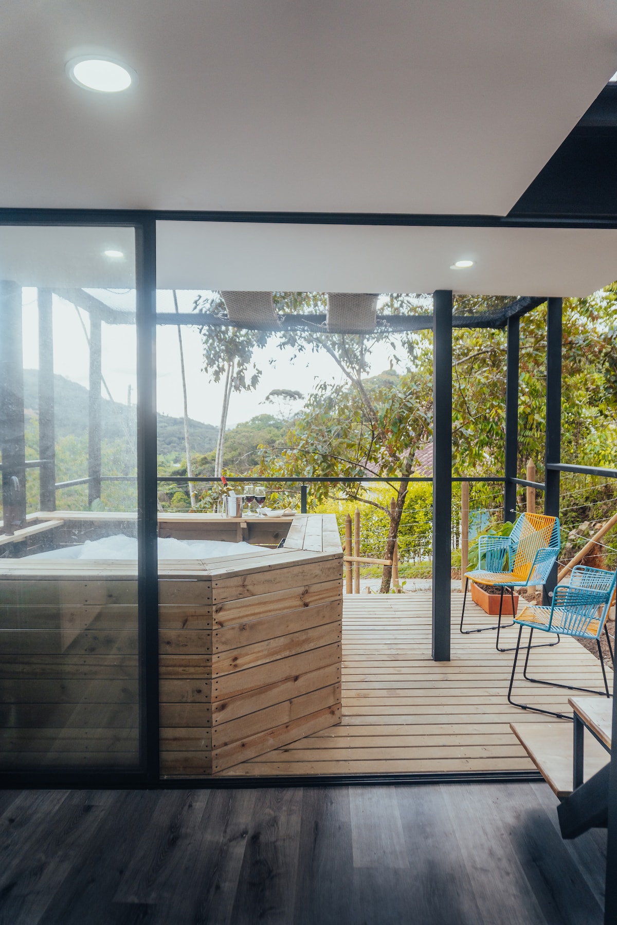 Enjoy a cabin surrounded by mountains, nature and silence, ideal for enjoying as a couple, sharing or teleworking in total privacy. The cabin has a unique architecture that provides comfort, spaciousness and an authentic experience in the middle of the forest. Enjoy a spacious panoramic deck with beautiful views, a quiet kitchen and warm and functional spaces. Located in the mountains but only 1 km and a 15-minute walk from the main park of San Carlos.