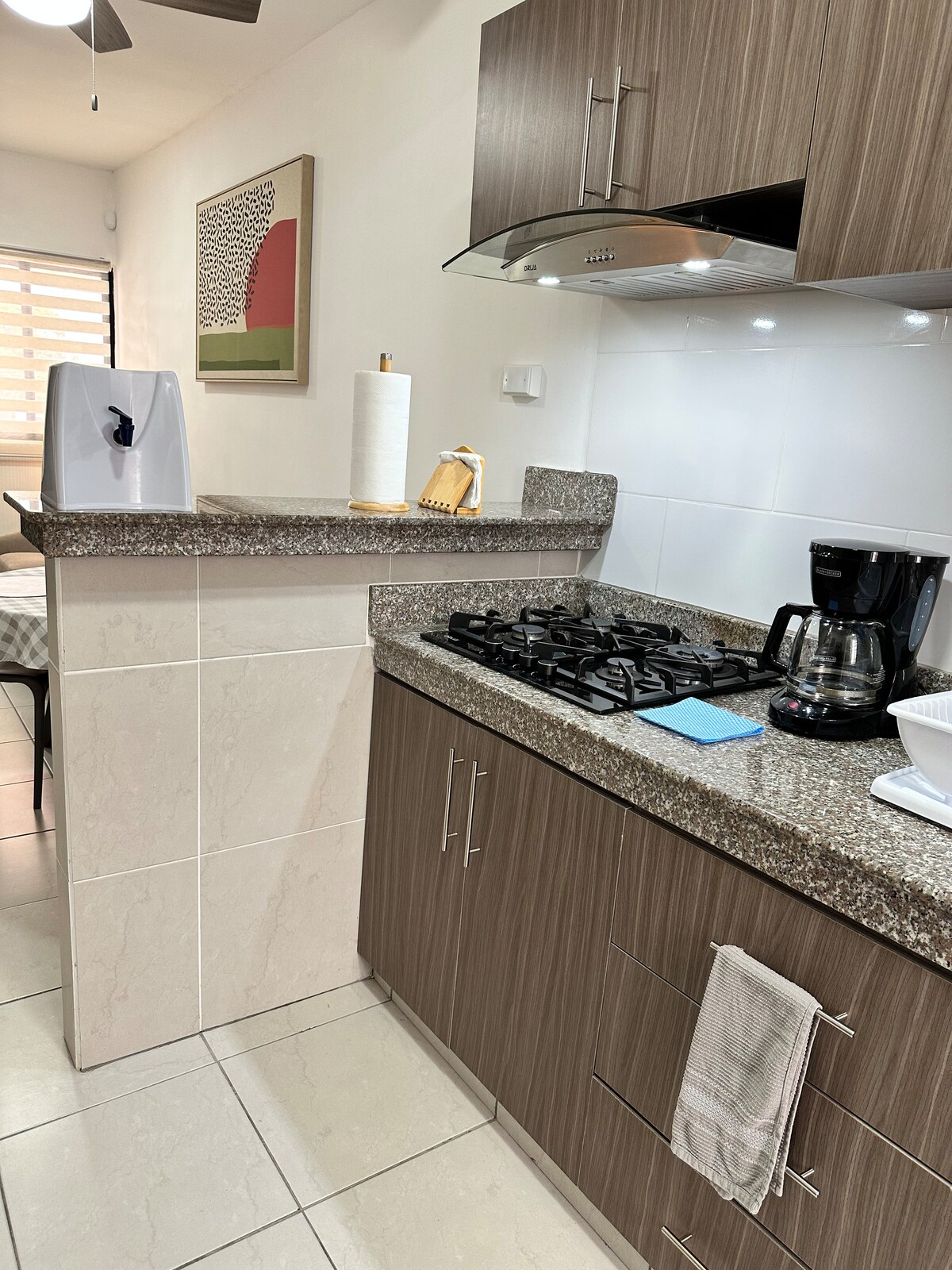 Suite with separate entrance: covered parking, double bed, bathroom, kitchenette and desk. Your personal space in the heart of David. It has split air conditioning, a ceiling fan, a TV with Netflix access, free WiFi internet, blackout curtains, a water reserve tank, hot water, a kitchenette equipped with an electric stove, a refrigerator, a coffee maker, a microwave, and basic utensils. It does not have a laundry room, electric generator, or soundproofing.