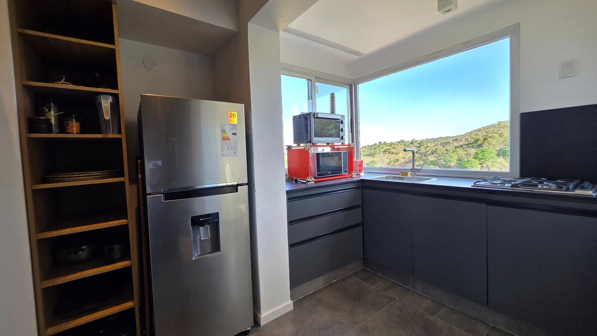 3 bedroom apartment with large integrated outdoor space. Experience the Villa's nature with an exclusive and unique view of the area. Premium quality furnished space, all new as of February 2022, terrace equipped to enjoy the outdoors with a large grill. Large swimming pool, fire pit next to the lake, lounge chairs, gym, water heating. Two covered garages, no stairs. 3 minutes from the cuckoo. 134m2 covered and 56m2 exterior, simply unique in Villa Carlos Paz.